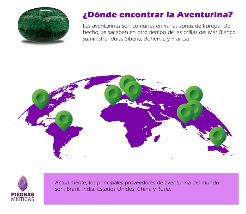 Actualmente, los principales proveedores de aventurina del mundo son: Brasil, India, Estados Unidos, China y Rusia.